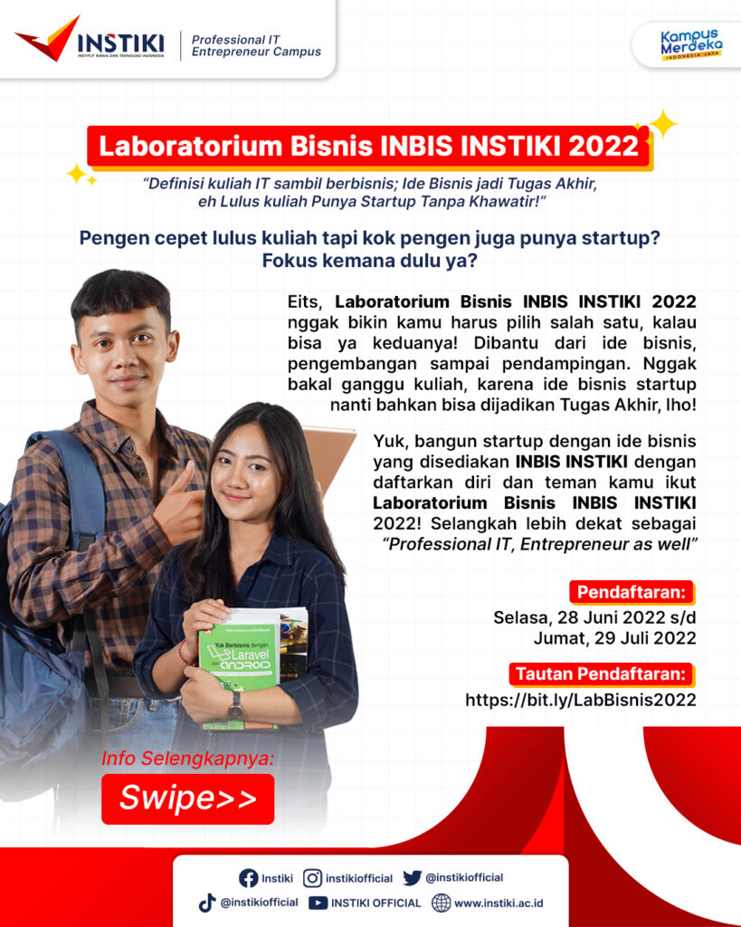 Yuk, bangun startup dengan ide bisnis yang disediakan INBIS INSTIKI dengan daftarkan diri dan teman kamu ikut Laboratorium Bisnis INBIS INSTIKI 2022! Selangkah lebih dekat sebagai “Professional IT, Entrepreneur as well”
